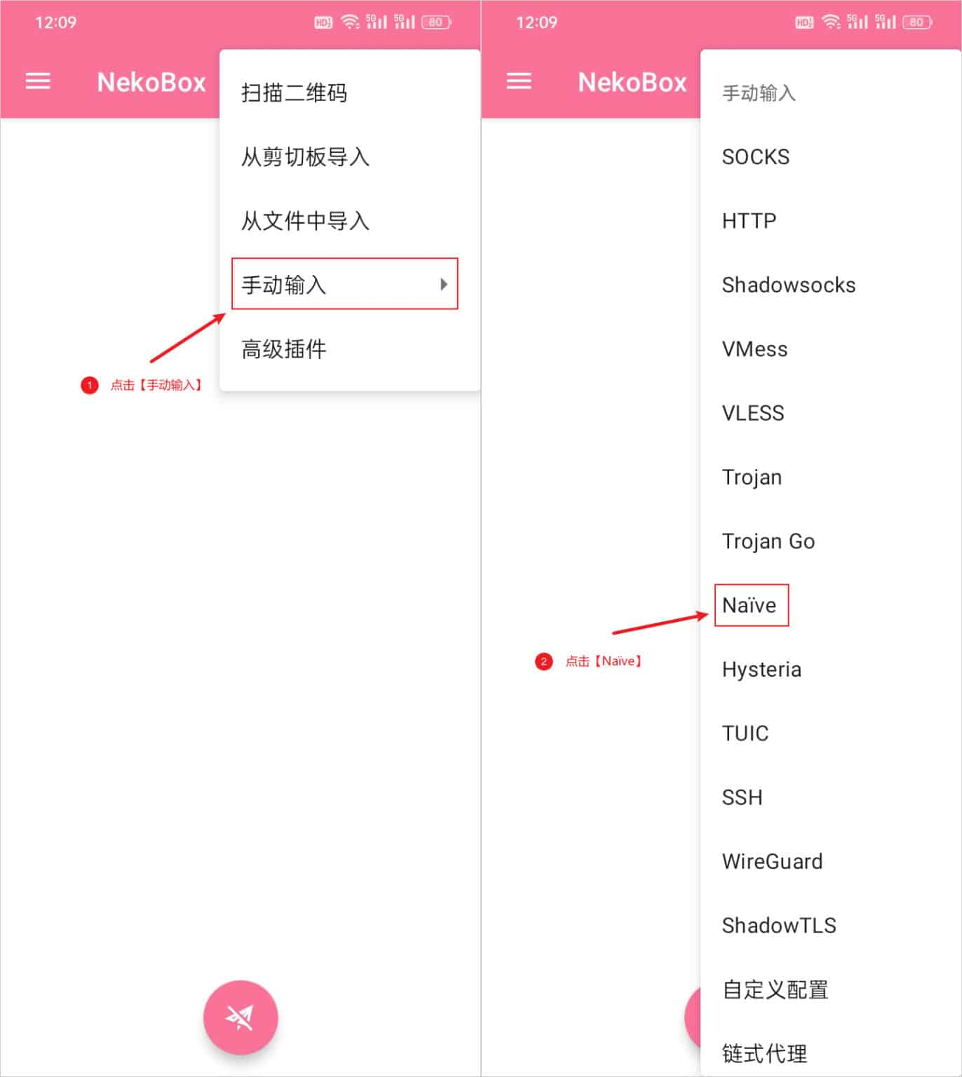 配置 Naïve 服务器节点,通过点击软件主界面右上角的 ➕ 号按钮即可出现添加配置文件选项,选择手动输入,随后在弹出的窗口中选择 Naïve 选项,如下图所示: