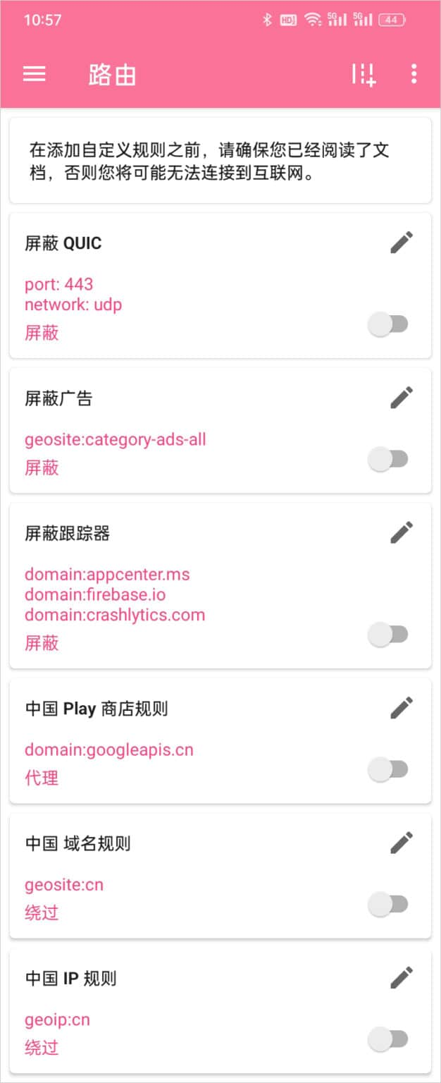 进入路由设置页面后,可以看到软件的各种路由规则,如下图所示: