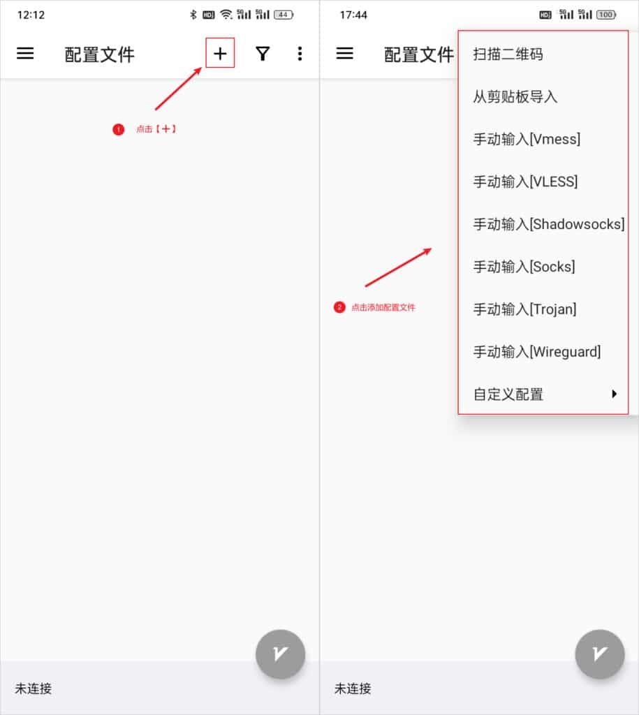 点击【➕】选择相应协议手动输入节点参数。