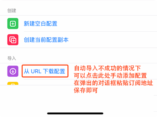 配置列表 向下滑动,找到 导入 – 从URL下载配置,然后将 复制的订阅地址 粘贴到弹出的输入栏中,点击“好的”按钮后客户端会自动下载配置文件。