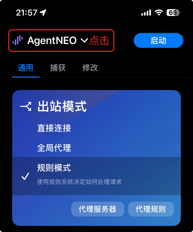 在首页点击右上角的 启动 或 停止 按钮即可切换 VPN 状态。