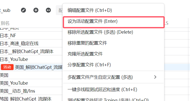 选择节点 → 鼠标右键节点“设置为活动配置文件”(快捷方式:鼠标左键选中节点然后按enter)